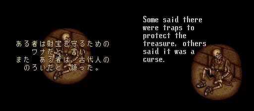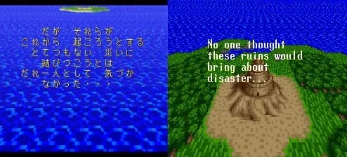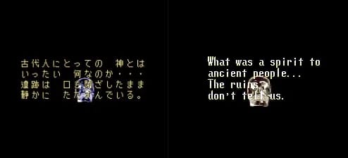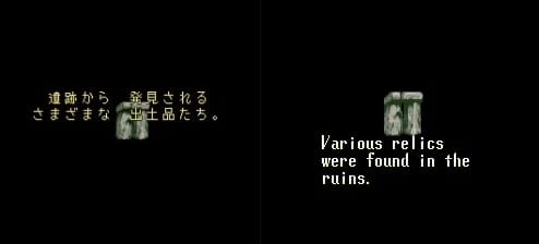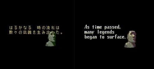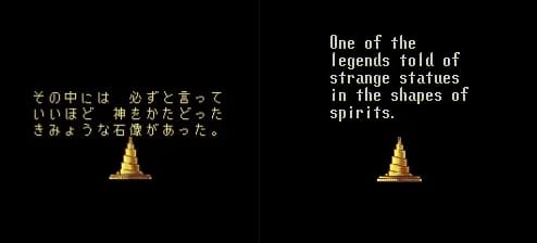 There’s also either a minor mistranslation, or an odd translation choice. The original English says that “one of the legends told of” the statues. But the JP refers to the previous sentence in the attract screen, which mentioned relics or artifacts, not legends.