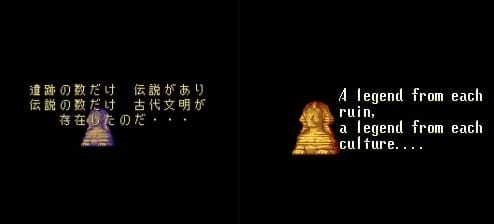 遺跡の数だけ 伝説があり 伝説の数だけ 古代文明が 存在したのだ... | A legend from each ruin, a legend from each culture…. | There were as many ruins as legends, and as many legends as ancient civilizations. |