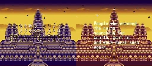 失われた時の みりょくに とりつかれた 人々は 遺跡へと 足をふみ入れ 帰らぬ人に なってゆく。 | People who entered the ruins, searching for wealth, went in, and were never seen again. | People who were obsessed with the lost age set foot into the ruins and into their doom. |