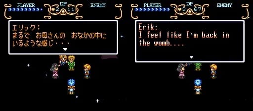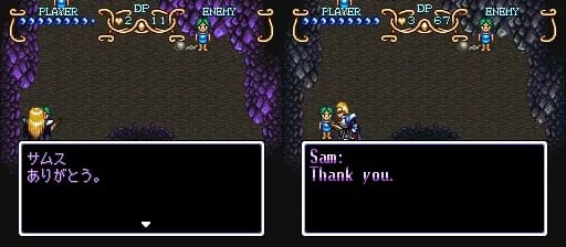 フリーダンの力 ダークフライヤーは つるぎの とどかない場所にいる敵を たおすことが できるのだ。 | Freedan’s power - The Dark Friar can defeat enemies in places a sword can’t reach. | Freedan’s power, the Dark Flyer, can defeat enemies out of his sword’s reach. |