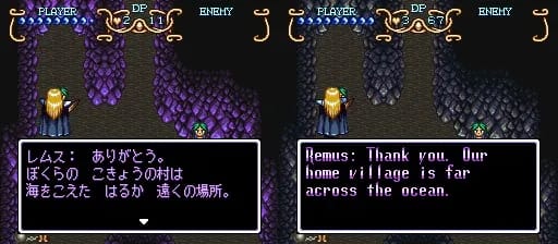 レムス: ありがとう。 ぼくらの こきょうの村は 海をこえた はるか 遠くの場所。 | Remus: Thank you. Our home village is far across the ocean. | Remus: Thank you. Our native village is somewhere far across the sea. |