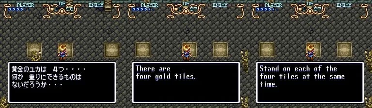 この 黄金のユカを ふむと 何か 音がするようだ... | Stepping on a gold tile emits a sound. | A sound can be heard if the gold tile is stepped on. |