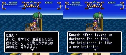 見張り: ずっと 暗ヤミで 生活をしてきた 我々にとって この海のかがやきは 神の光に 見えますよ。 | Guard: After living in darkness for so long, the brightness is like a new beginning. | Lookout: For us, who have lived in darkness for so long, the ocean’s shine looks like the light of god. |