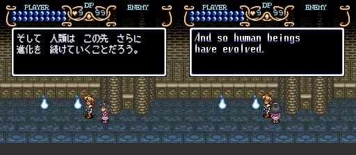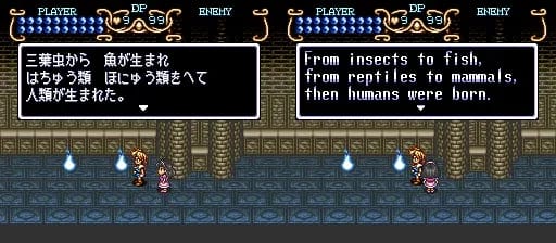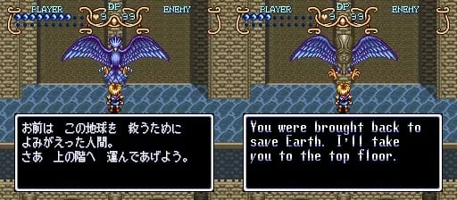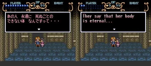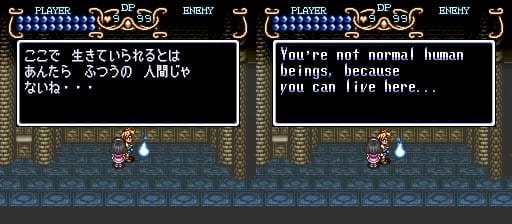 よみがえった人間 (yamigaetta ningen) means person/human who was resurrected/revived/restored. I’m not sure what meaning they’re going for here. Later on the game will talk about Light and Dark Warriors, and maybe it’s talking about Tim being the new Dark Warrior. Or maybe it’s saying he’s a reincarnation of some previous hero, like the guy from Soul Blazer? Idunno.