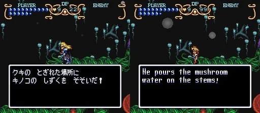 クキの とぎれた場所に キノコの しずくを そそいだ! | He pours the mushroom water on the stems! | Poured the Mushroom Drops onto the place where the plant was broken! |