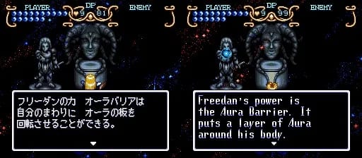 オーラバリアは ヤミの戦士フリーダンだけが 使える ヤミのちから。 | The Aura Barrier is a Dark Power that can only be used by the Dark Knight, Freedan. | The Aura Barrier is a Dark Power that only the Dark Knight Freedan is able to use. |