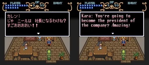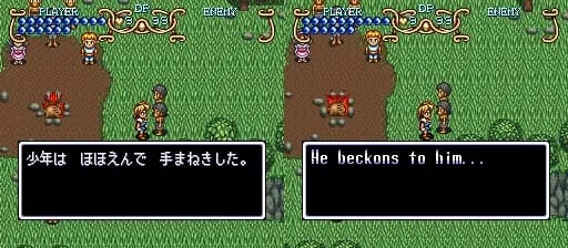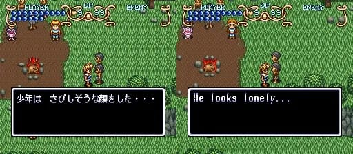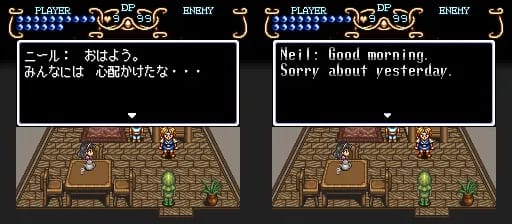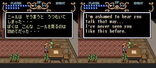 Yikes! This mistranslation makes Tim seem like a total jerk. (Y’know, aside from the gambler killing and slave trader assisting and whatnot.) A few things threw the translator off. First of all, this is narration from Tim, not something he’s saying to Neil. If it were supposed to be speech, it would normally be prefaced with an indicator that Tim is speaking. (It would say テム:) Given that they thought Tim was speaking to Neil, they thought he was saying that his own eyes were cast downward. Presumably in shame. But no, Tim’s describing Neil’s demeanor.