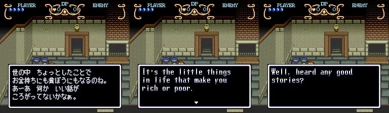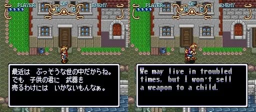 最近は ぶっそうな世の中だからね。 でも 子供の君に 武器を 売るわけには いかないもんなぁ。 | We may live in troubled times, but I won’t sell a weapon to a child. | I know the world is dangerous nowadays. But I still can’t justify selling a weapon to a child like you. |