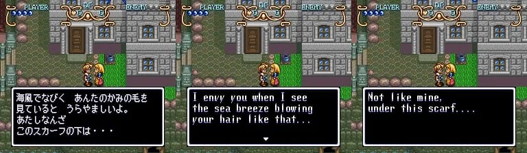 海風でなびく あんたのかみの毛を 見ていると うらやましいよ。 あたしなんざ このスカーフの下は... | I envy you when I see the sea breeze blowing your hair like that… | I’m jealous of how the sea breeze blows your hair around. But mine is under this scarf. |