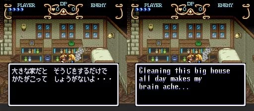 The OE is accurate but I find this line curious. Why doesn’t she take the scarf off? I realized that every adult woman in town except Tim’s grandma is wearing one of these. They all have the same sprite. So I’m going to guess it’s some draconic local law and move on.