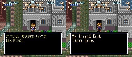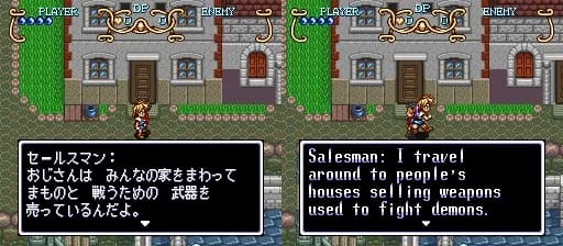 セールスマン: おじさんは みんなの家をまわって まものと 戦うための 武器を 売っているんだよ。 | Salesman: I travel around to people’s houses selling weapons used to fight demons. | Salesman: I’m visiting everyone’s house to sell them weapons, so they can fight monsters. |