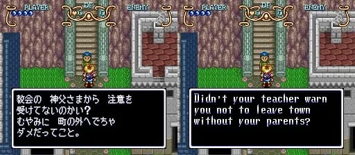 教会の 神父さまから 注意を 受けてないのかい? むやみに 町の外へでちゃ ダメだってこと。 | Didn’t your teacher warn you not to leave town without your parents? | Haven’t you heard the priest’s warnings? It would be reckless to go out. |