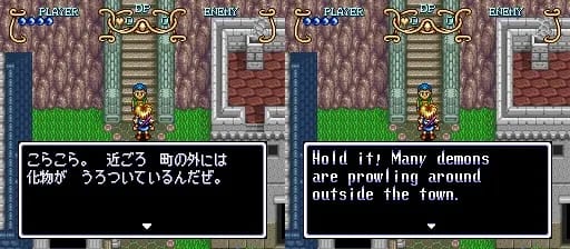 こらこら。 近ごろ 町の外には 化物が うろついているんだぜ。 | Hold it! Many demons are prowling around outside the town. | Hey, hey! Monsters have been prowling outside the town recently. |