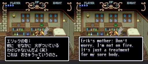 エリックの母: 別に せなかに 火がついている わけじゃないんだよ (笑) これは おきゅうっていうのさ。 | Erik’s mother: Don’t worry, I’m not on fire. It’s just a treatment for my sore body. | Erik’s mother: No, my back’s not on fire. Hahaha. This is called “moxibustion”. |