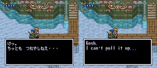 けっ。 ちっとも つれやしねえ... | Gosh. I can’t pull it up… | Tch. Can’t catch anything here. |